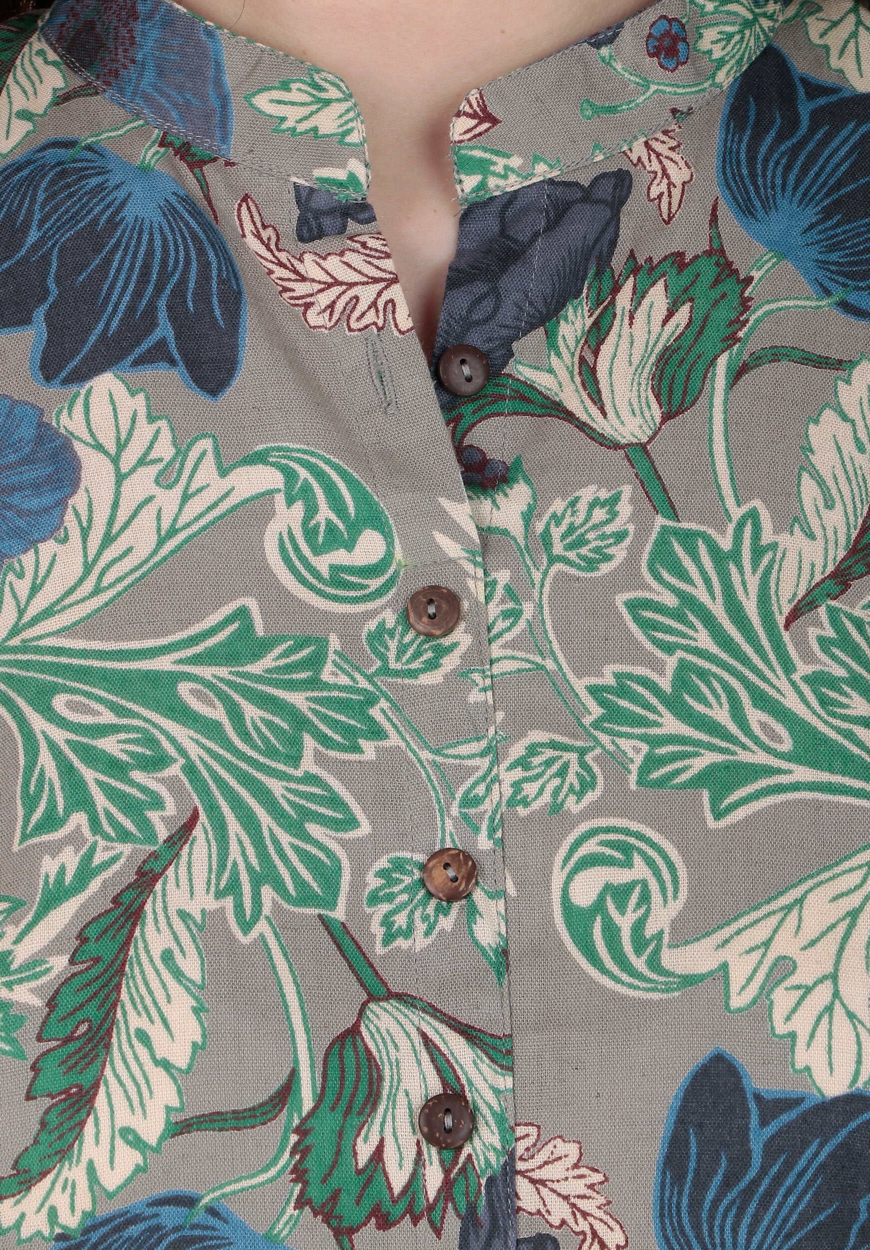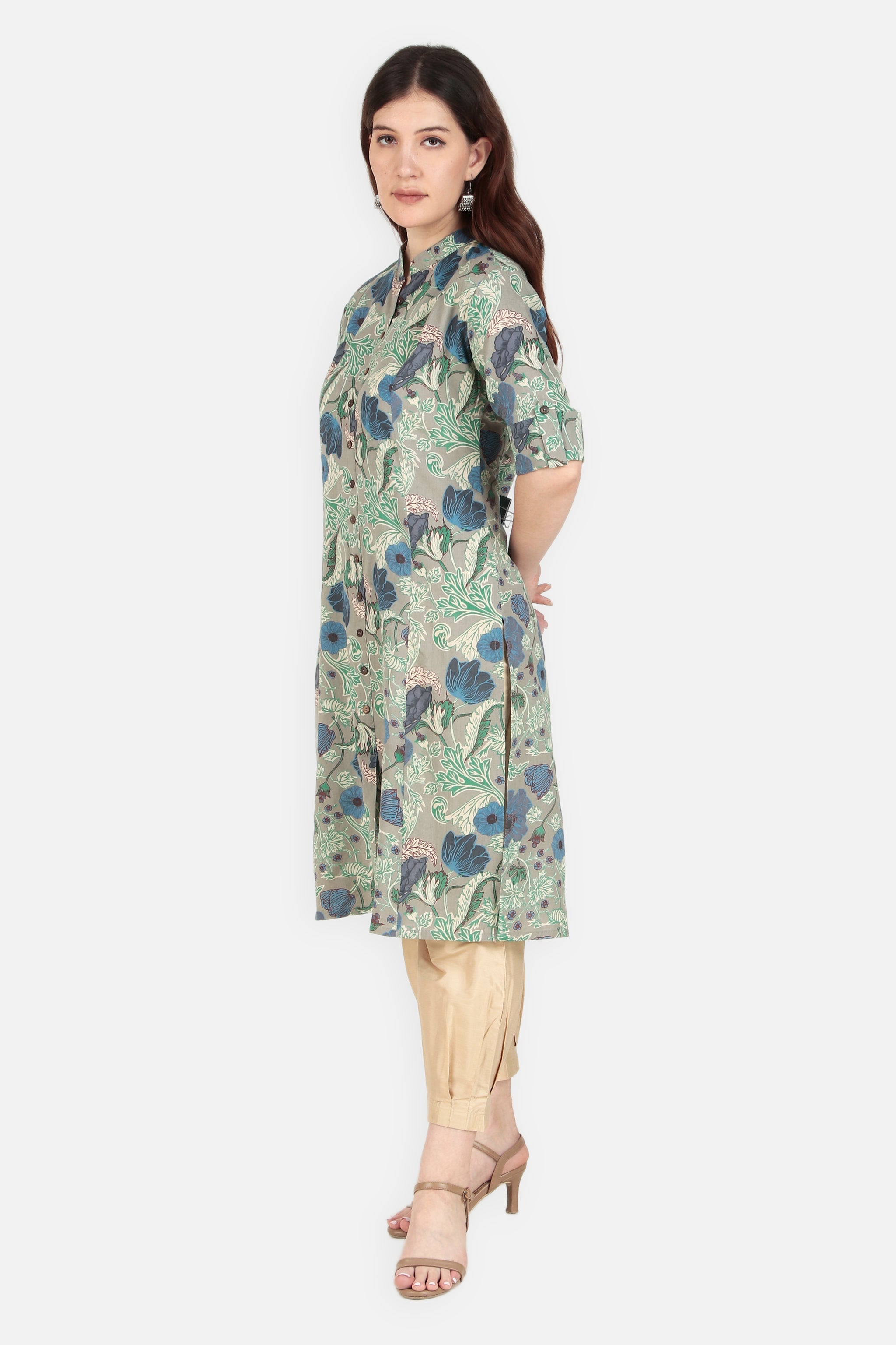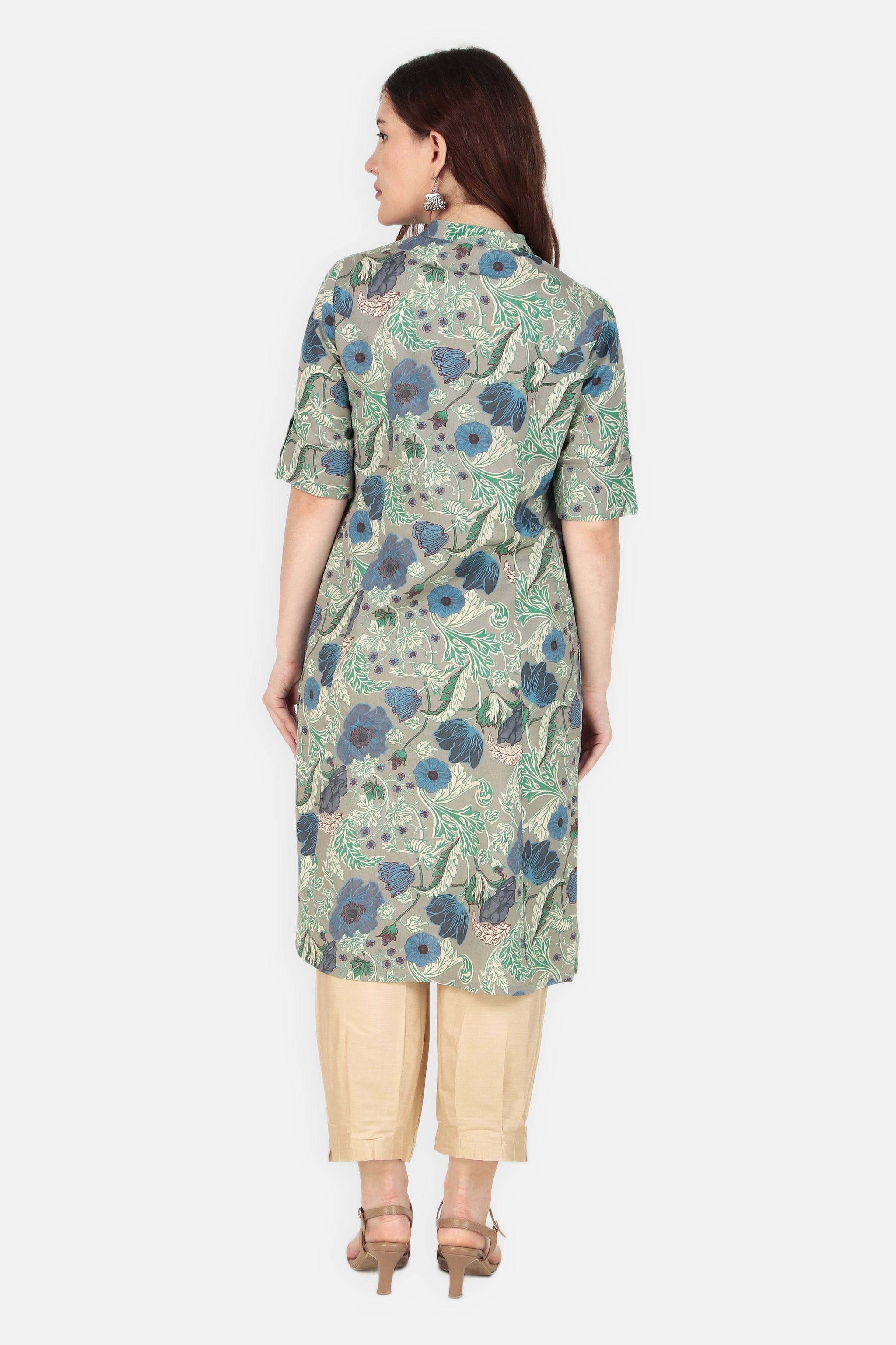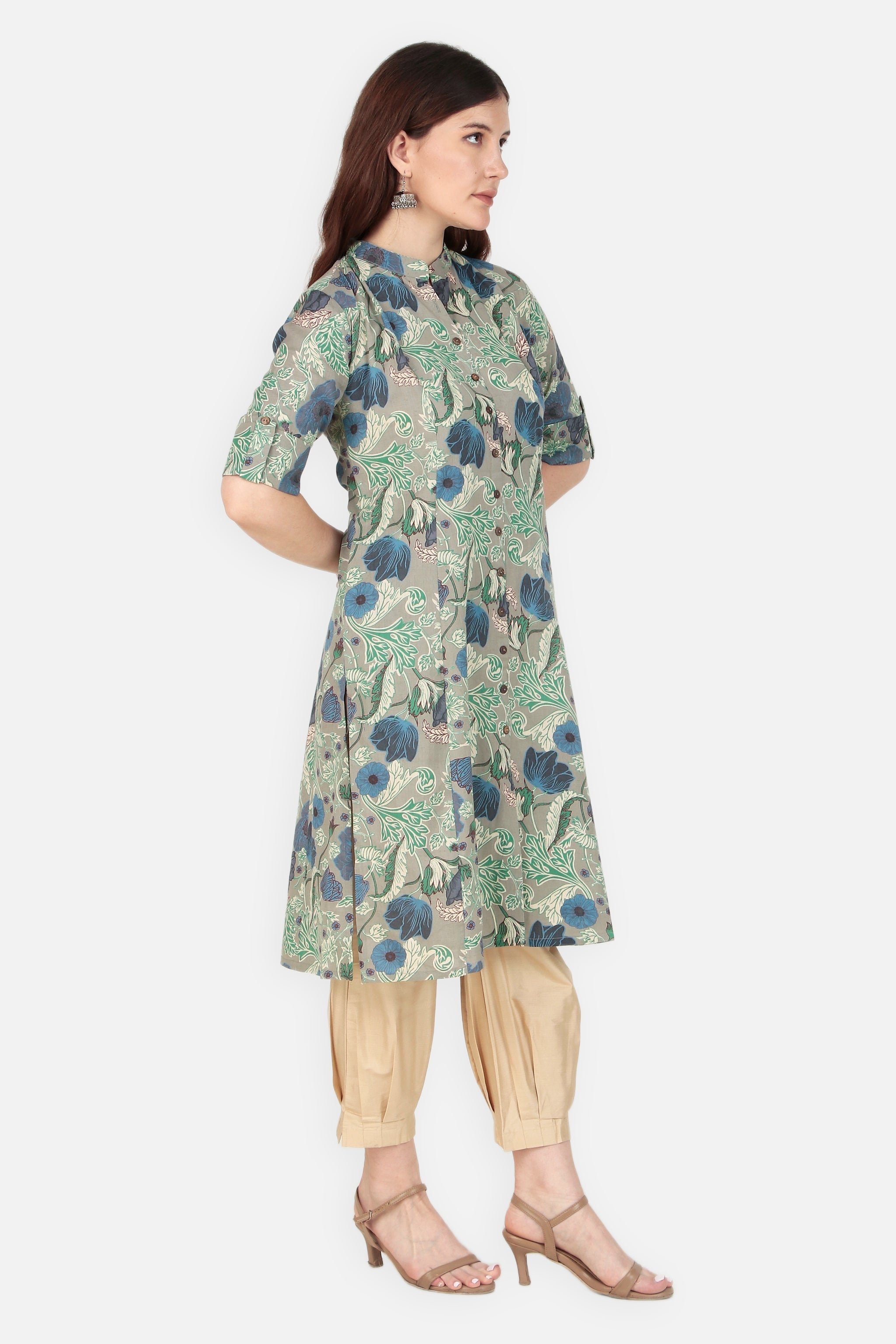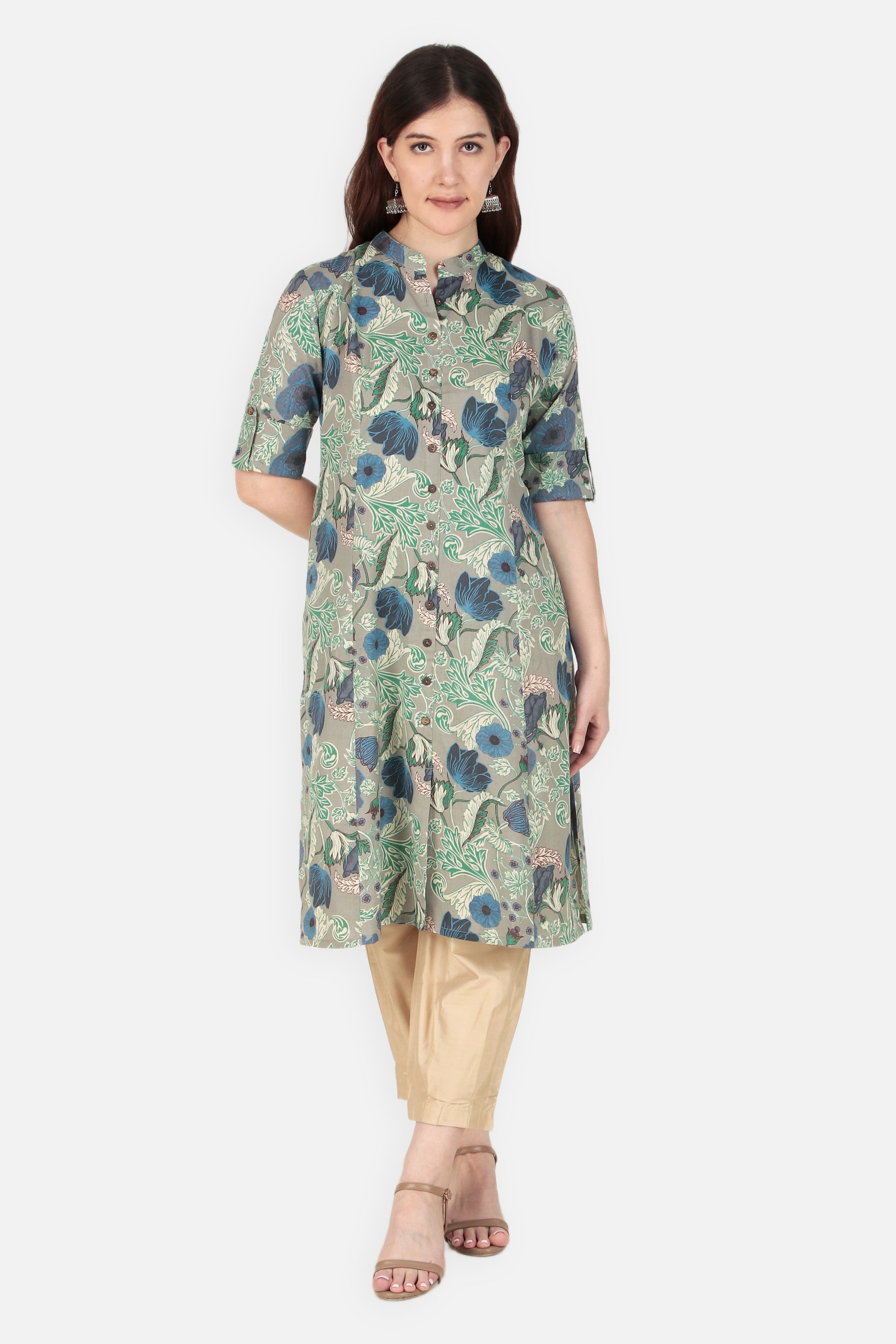 A Line Printed Flax Floral Women Kurta Grey | Verbe