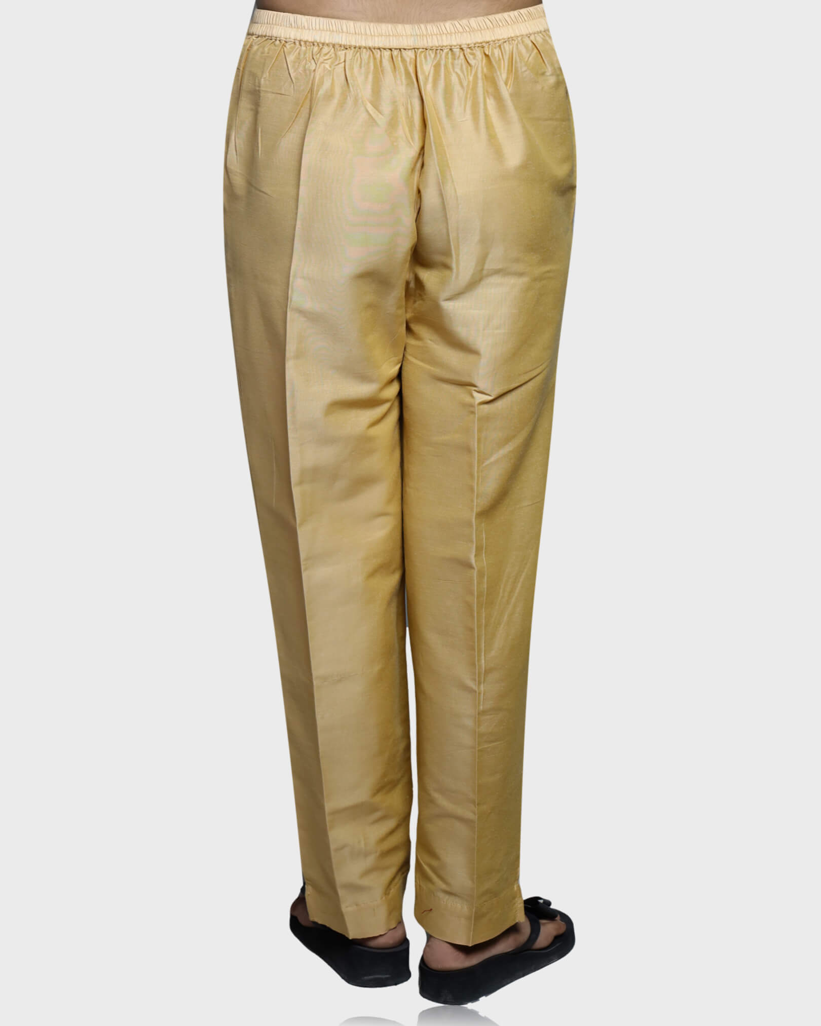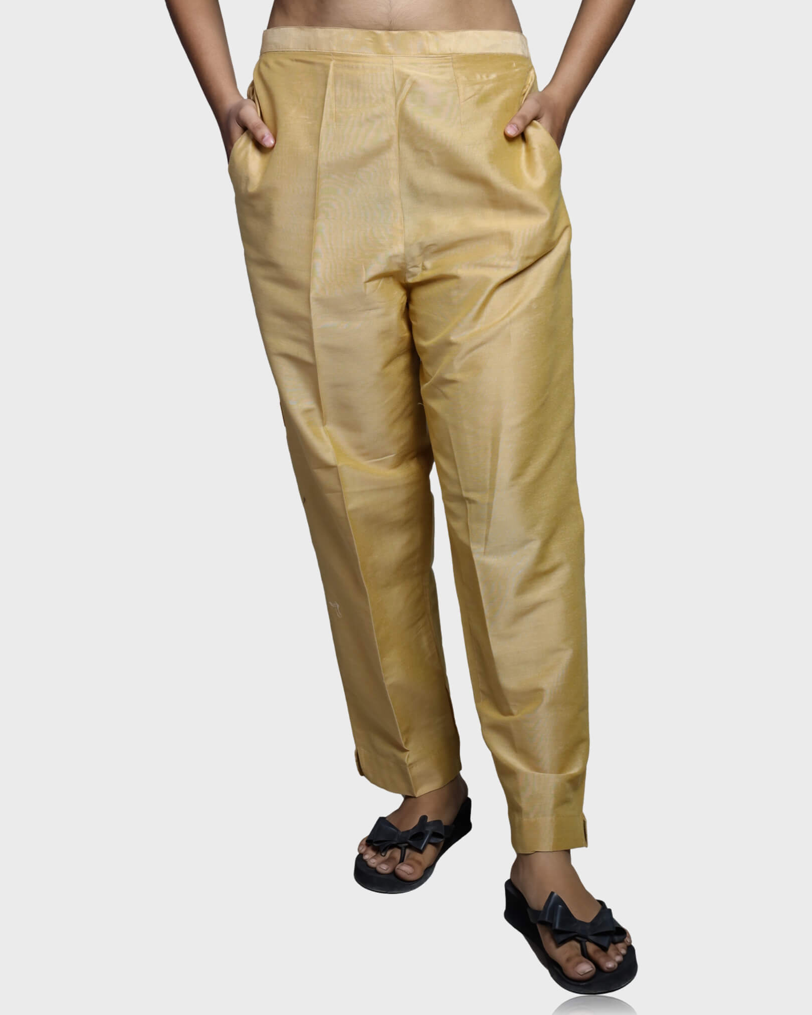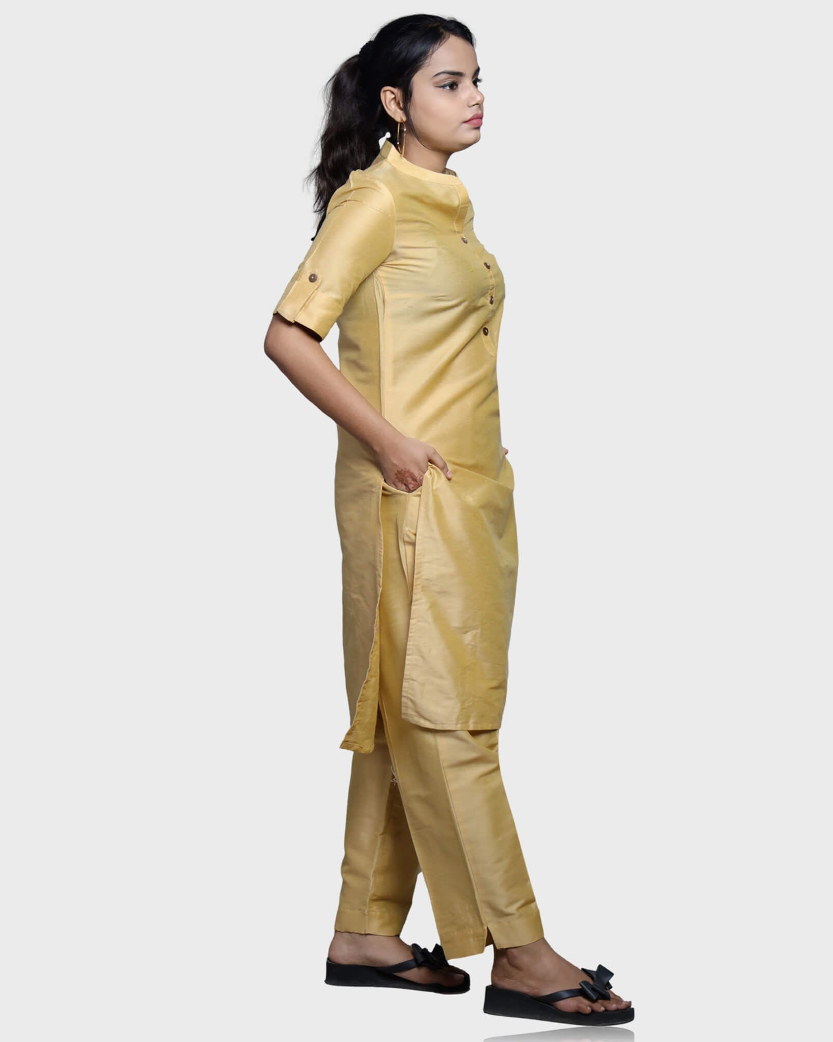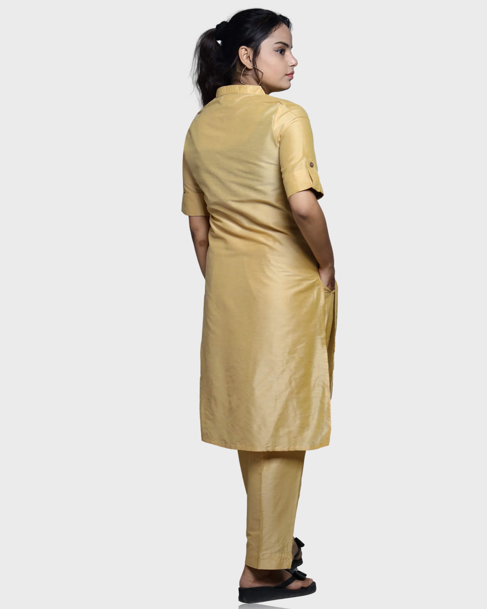 Silkfab Women's Banarasi Silk Beige Solid Kurti Pant Set